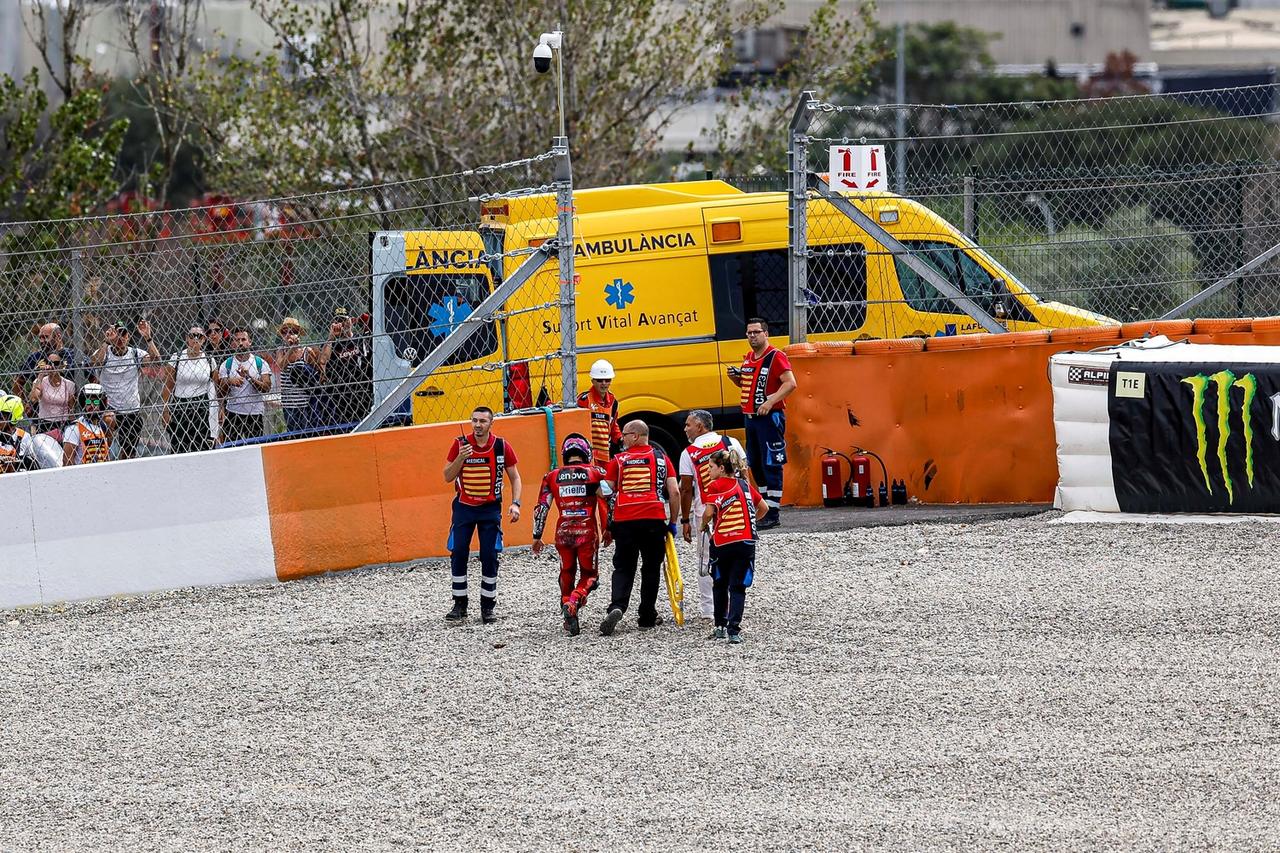 Aggravando la situazione, Brad Binder di KTM Factory Racing – che stava seguendo nel gruppo dietro di lui – non è riuscito ad evitarlo, colpendo le gambe del pilota italiano. Nonostante la gravità dell’incidente, i test medici, inclusi raggi X e TAC eseguiti all’Hospital General de Catalunya, hanno escluso fratture, evidenziando solo una serie di contusioni.