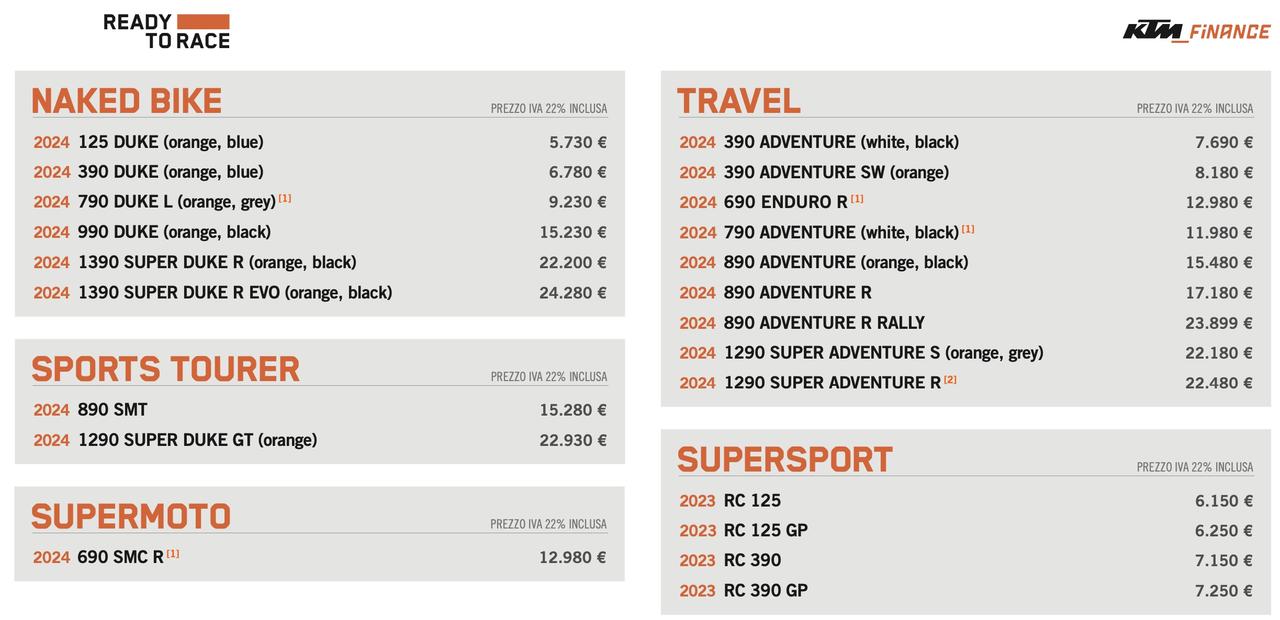 I prezzi sono inclusivi dell’IVA al 22%. Il listino entrerà in vigore dal 1° dicembre 2023. KTM continua a dimostrare la sua capacità di innovare e soddisfare le esigenze più disparate dei motociclisti, confermando il suo impegno verso la qualità e la performance. Con queste nuove offerte, il brand austriaco si posiziona in modo ancora più forte nel mercato italiano, offrendo ai motociclisti un’ampia scelta di modelli adatti a diverse esigenze e stili di guida.