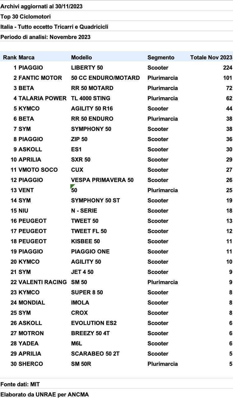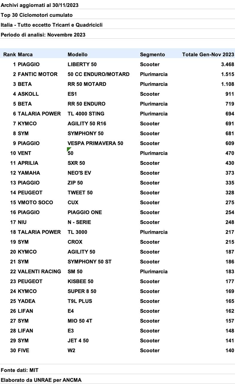 A novembre 2023, il mercato ha registrato 16.784 unità vendute, segnando un aumento dell’1,78% rispetto al 2022. Il segmento delle moto ha visto una crescita robusta, con 7363 esemplari immatricolati, un aumento del 15,26%. Contrariamente alle moto, gli scooter hanno subito una flessione del 3,88%, con 8382 unità vendute, mentre il calo più significativo si è verificato nei ciclomotori, con un decremento del 24,82%, equivalente a soli 1039 veicoli registrati.