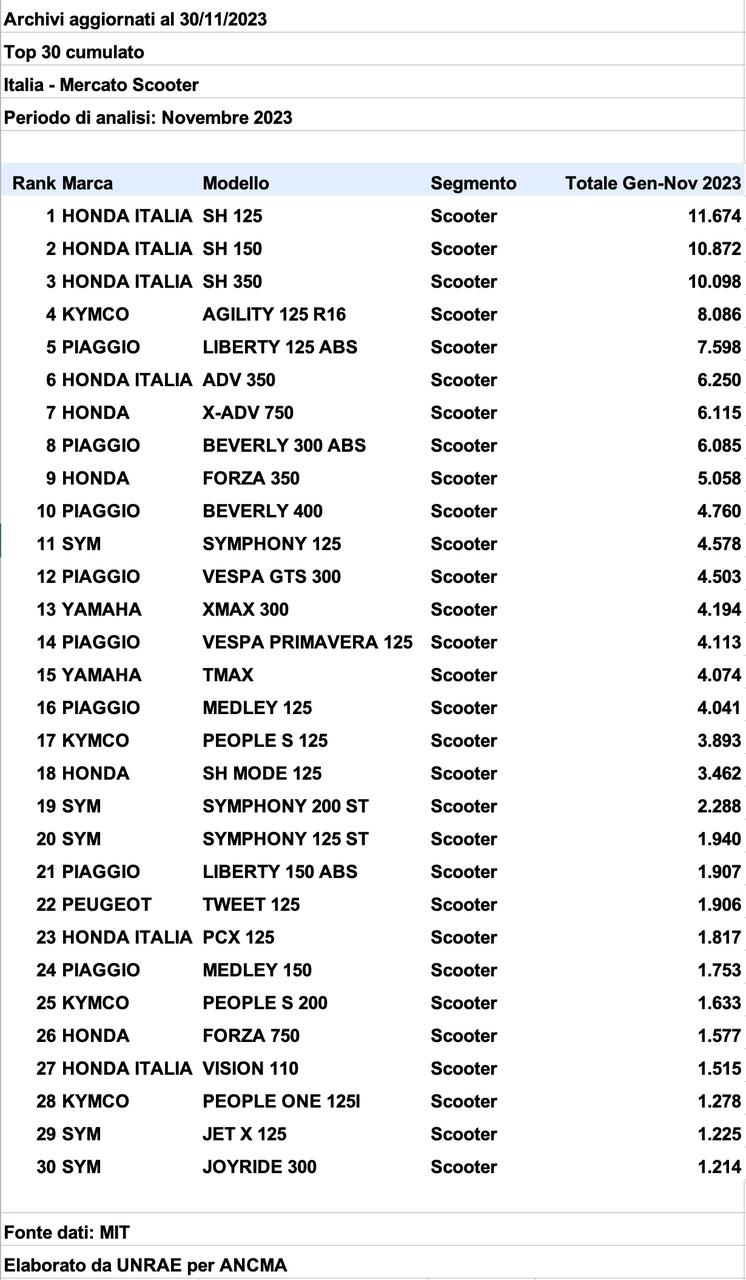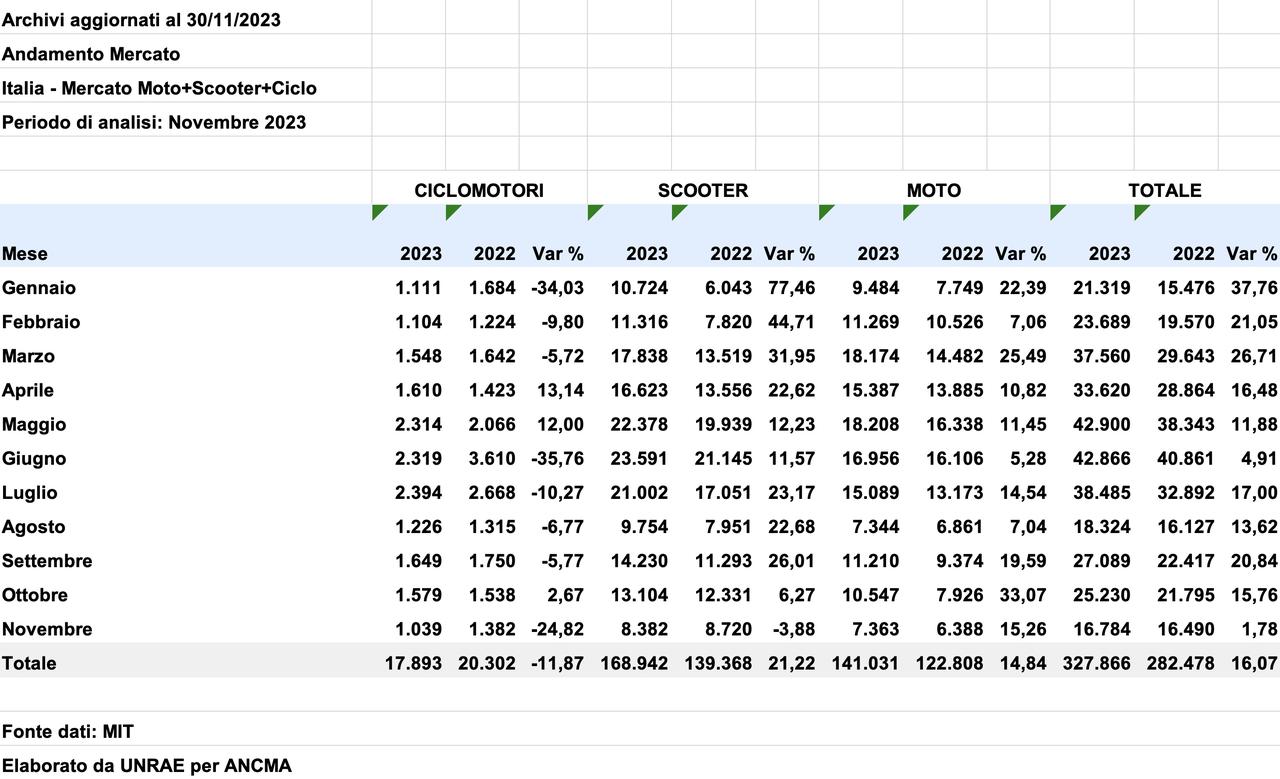 Il 2023 ha visto una crescita complessiva del 16,07%, con 327.866 unità vendute. Gli scooter hanno mantenuto la leadership nel mercato, con un incremento del 21,22% e 168.942 unità vendute. Le moto hanno registrato una crescita del 14,84%, con 141.031 unità immatricolate, mentre continua il trend negativo per i ciclomotori, con una flessione dell’11,87%.