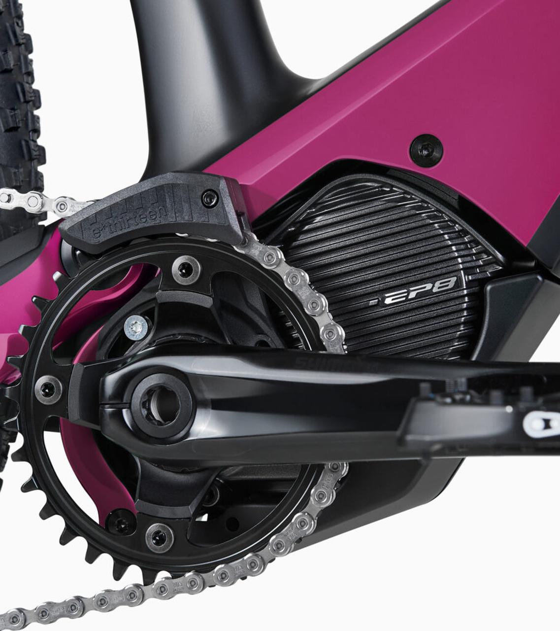 Il design prende ispirazione sia dalla 911 che dalla Taycan e abbiamo un motore elettrico Shimano EP-801 e una batteria da 630 Wh. Entrambe vantano lo stesso telaio in carbonio, una forcella Fox 34 Float Factory con 120 mm di escursione, un ammortizzatore ad aria Flat DPS e una molla da 100 mm.