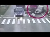 Biker jumps from motorcycle seconds before truck ploughs into it